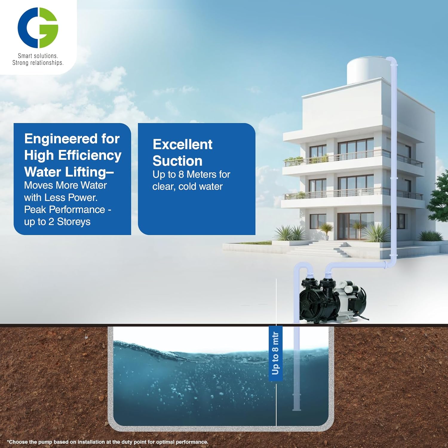 Pump Performance: Designed for high-efficiency water lifting, this pump provides excellent suction power of up to 8 meters, making it ideal for small high-rise buildings, small farmhouses, small hospitals, and flats. It ensures high discharge even in its operating range.