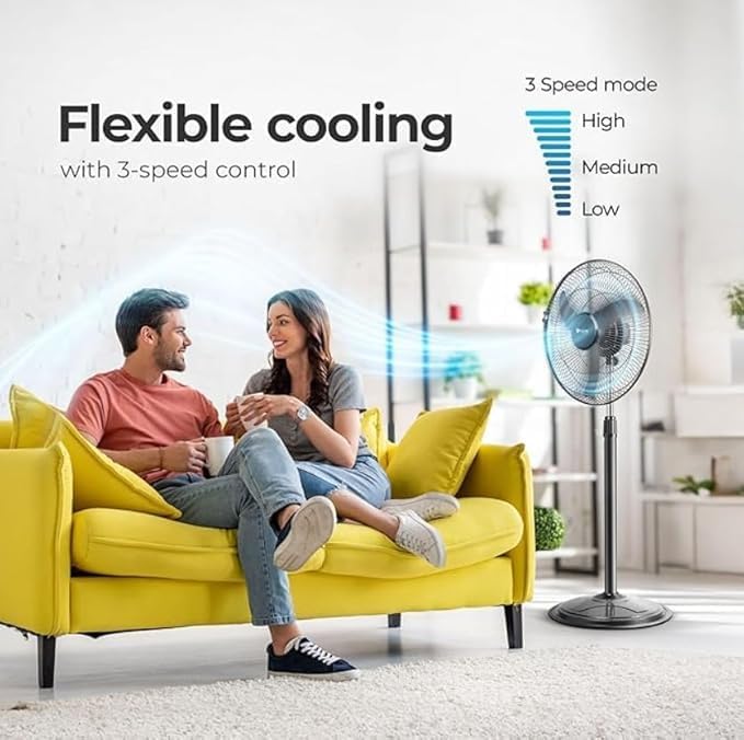 The matte black finish combined with balanced blade design and secure guard offers a premium look and feel, while functional features like three-speed rotary control and wide-angle oscillation provide personalized comfort.
