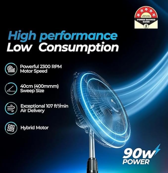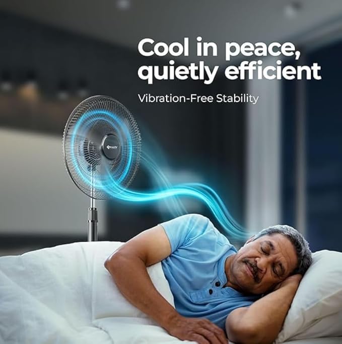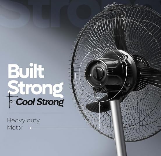Heavy-duty construction with aerodynamically designed aluminium blades and powder-coated metal guard supports long-term use. Includes thermal overload protection (TOP) and stable, heavy-duty base for safe operation. Telescopic height adjustability and jerk‑free oscillation add usability and flexibility.