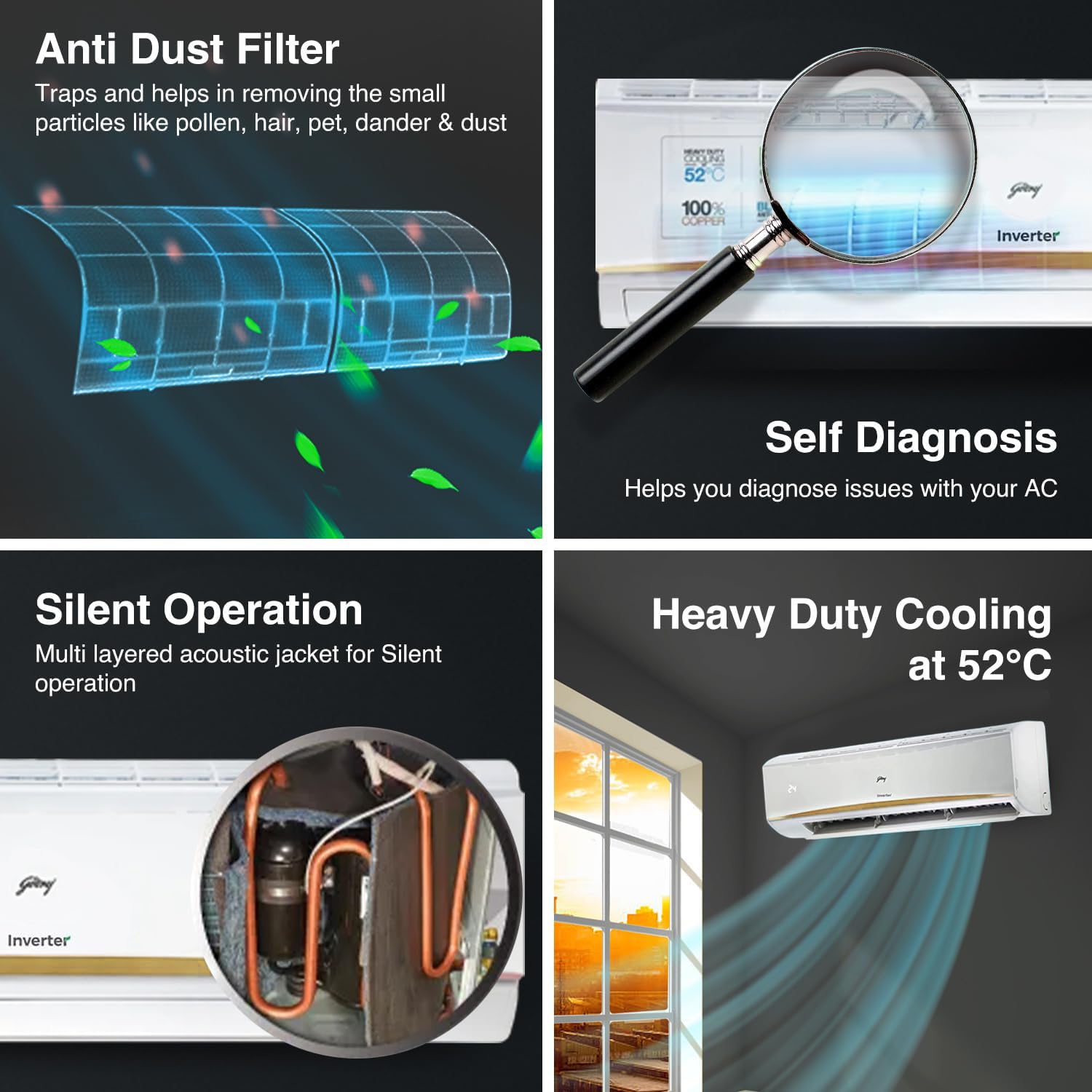 Experience powerful and energy-efficient cooling with the Godrej 2.5 Ton 3 Star Inverter Split AC.Equipped with 5-in-1 convertible cooling, I-Sense technology, and a 100% copper condenser, this AC ensures optimal comfort even at temperatures up to 52°C.