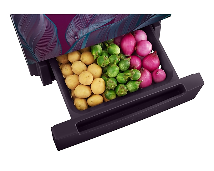 Jazz up your kitchen with this stunning Paradise Bloom Purple double-door fridge. Featuring a whisper‑quiet digital inverter compressor (20 yr warranty), frost‑free cooling, handy base‑stand drawer, and optimal freshness features—it’s the perfect blend of convenience and style for modern homes.